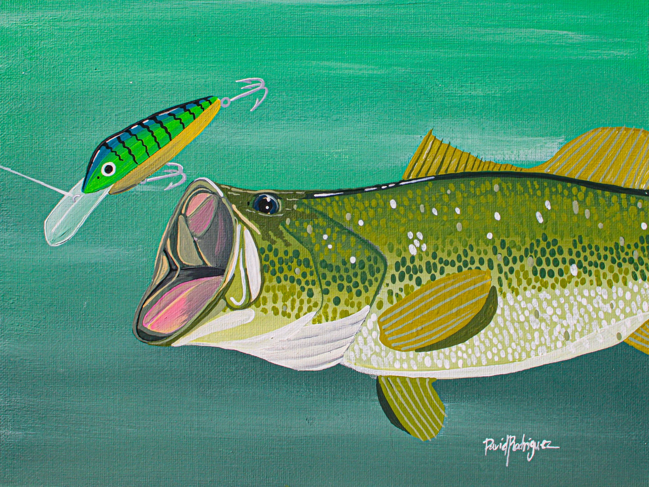 Image 1 of 1 Largemouth Attack $100.00 9×12 Acrylic on canvas board Purchase Added! 9×12 Acrylic on canvas board